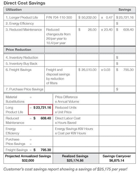 Switching to AAF’s DriPak 2000 filters extended the life of the filters from two weeks to five weeks before the filters had to be replaced. Due to the extended life of the AAF filters, the plant decided to replace all of the competitor’s filters and realized an annual product cost savings of $23,720 for the six AHUs. As part of the plant’s continuous improvement program, additional savings were calculated, due to reduced maintenance and freight savings. Total cost benefit was $25,175 per year.