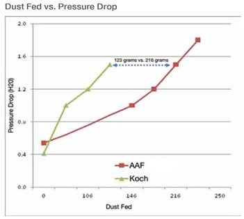 As seen in the graph below, the VariCel M-Pak filter holds more dust than the Koch 2V filter. The hospital ran trials of their own on the filter, and the results were the same. The hospital therefore immediately made the switch to the VariCel M-Pak filters.