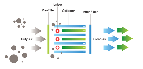 Electrostatic Precipitator Technology consists of the Pre-Filter, Ionizer, Collector and After Filter sections. The Pre-Filter section filters out coarse particles from the contaminated air, while the Ionizer section charges the fine particles that are not filtered by the pre filter. These charged particles will then enter the Collector section which is made up of parallel spaced plates. Each alternating plate is charged with the same polarity as the charged particles which will in effect repel the particles on to the other set of plates that is grounded. The particles will remain collected at the grounded plates until they are washed away. The after filter section is entirely optional. Whether it is for removal of odours or hazardous gases, this section is customizable to meet the customers’ needs as AAF has a full range of filtration products capable of serving their requirements.